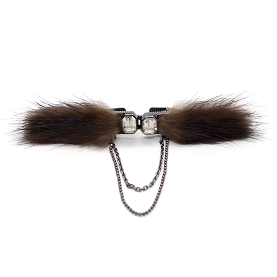 大粒クリスタルガラスにミンクファーをあしらい、ラグジュアリーな仕上がりに。
