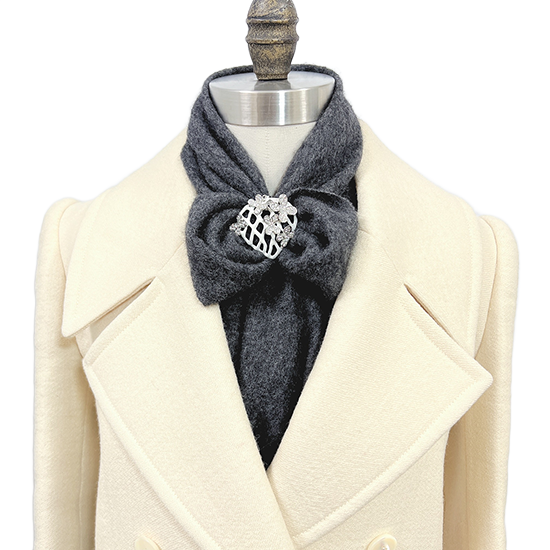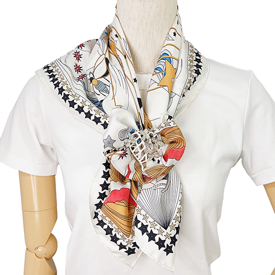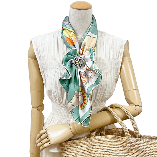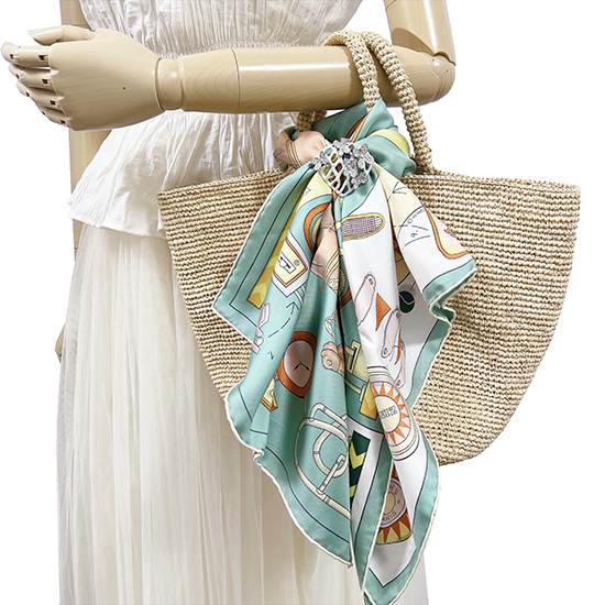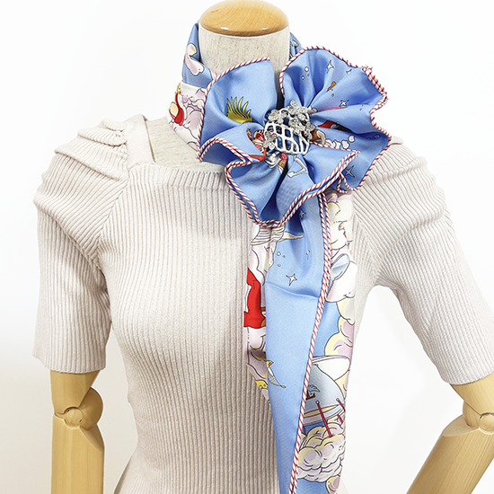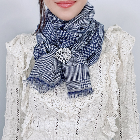 スカーフが網目から透けるのでなじみやすく、スカーフを変えるとデザインの印象も変わります。