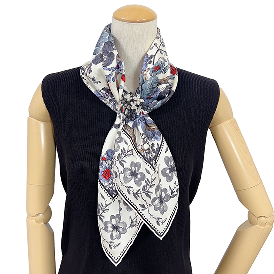 スカーフが網目から透けるのでなじみやすく、スカーフを変えるとデザインの印象も変わります。